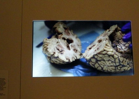 有一个区域是专门展示这些患者的脑子的,他们在捐献大脑前录下了一段话,参观者可以拿起耳机站在捐献者的照片前听他说完这些话,说什么的都有。这感觉挺酷的,上一秒还是主体,下一秒就是客体。