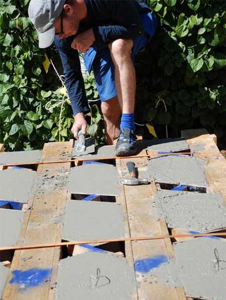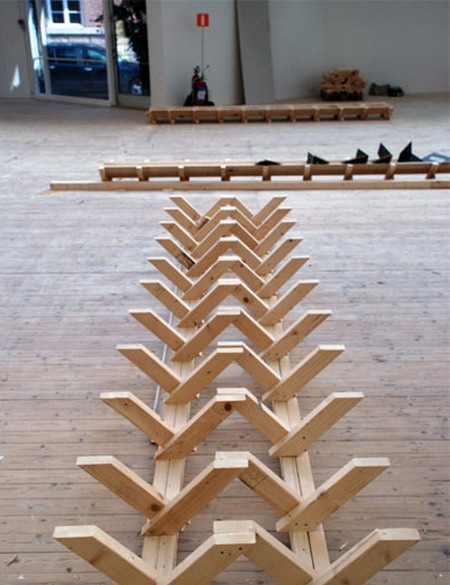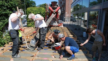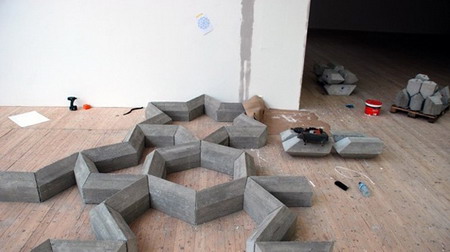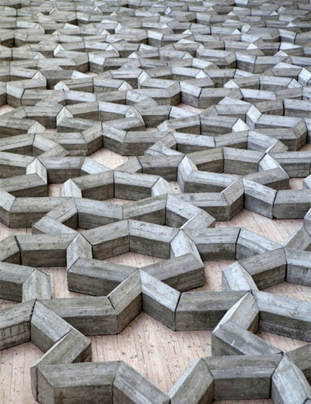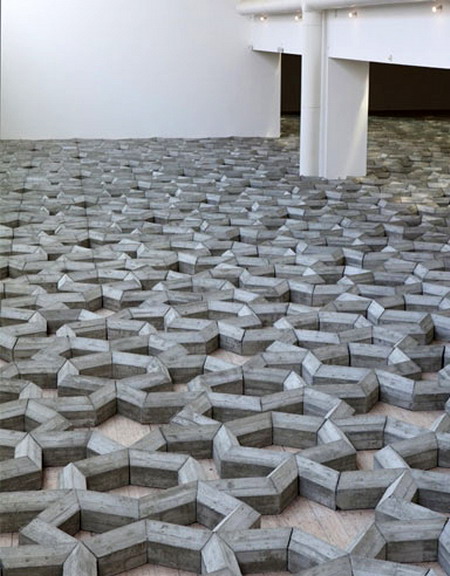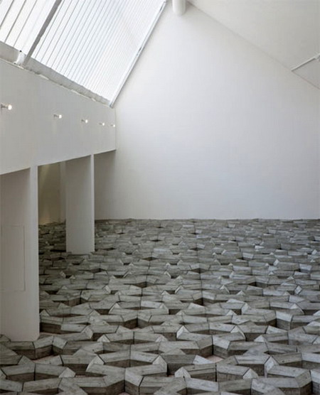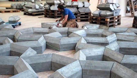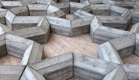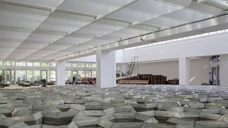 “生产车间”被用来浇铸了上千块混凝土砖,而成型的混凝土则被铺在了整个地板上,形成了一种看起来像是一张盖满了整个剩余空间的网一样的网格结构。重达408吨的混凝土砖块形成了一个完整的几何图形,它会让人联想到被广泛地应用于许多宗教或相当的信仰体系中的早期的装饰设计。迈克·尼尔森(Mike Nelson)热衷于将创作过程透明化以强调真正被展示出来的东西。在这场展览中,“生产车间”及浇铸过程的可见性反复清晰地实现了他的这个愿望。