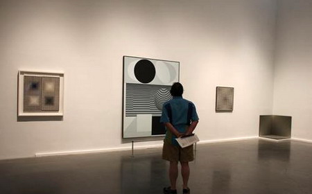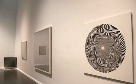 走进四楼展厅,映入眼帘的是一件件欧普艺术作品,也就是使用重复精準的几何图形,在平面上產生深度或动态视觉效应的抽象绘画。1960年代,当科技带来电视、电影、电脑等新媒体之际,有些艺术家尝试在传统的媒材上做出特殊的视觉效果。与1940至1950年代充满个人情感表达的抽象绘画不同,欧普艺术将作品视為高度科学的產物,而其图样及效果也影响了商业图案、流行时尚等设计的发展。英国艺术家布里姬.莱丽(Bridget Riley, 1931-)是最著名的欧普艺术家之一,她的作品〈分裂〉(1963)以黑色圆点在白底画板上做大小及间距的些微变化,〈刀片1〉(1962)则是锯齿形的黑色线条环绕著画面中心,直视作品,感觉画面似乎在流动旋转一般,充满动态感。虽然艺评家认為欧普艺术的目的仅是欺骗视觉,但莱丽强调她的作品的出发点是营造一种紧绷感,因此焦点仍是放在情绪的衝击。