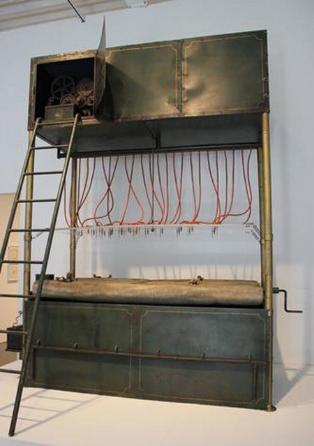 展品中,一件令人不禁背脊发冷的,是依照德国作家卡夫卡的短篇小说《在流放地》(1919)的描述所建製的刑具。这件称為「耙子」的机械刑具,是一个非理性法律系统下的產物。受刑者在上刑台前,只知道自己有罪,却不知道罪名是什麼。趴上刑台,他们的罪名便会以尖锐的针,以十二小时缓慢写在罪犯的背上。虽然背上的痕迹很难理解,但是听说罪犯在第六个小时,就会经验一种疯狂的领悟,而自然了解他们的罪名。很明显的,小说透过这样的刑具来回应机械的时代,也探讨人们的态度。