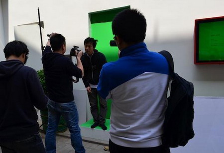 石: 我理解是这样的不知道对不对,从物理层面上这个门是关着的,也就是观众走到本来是可以打开的门前面,他走不通。但是因为门被涂为绿屏,实际上,虽然你进不了一个物理属性的门,但是因为绿屏技术它可以让你打开另外一个——就是你可以通过这个打不开的门去到任何全世界你想去的地方。那么这个门的象征意义就非常的充分。