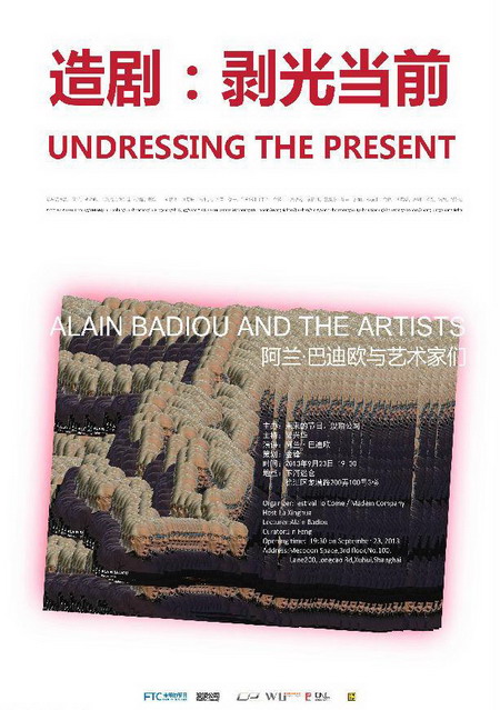 二十个艺术家,用视频、雕塑、装置、动画、声音和海报,搭出“当代”脚手架,去激活一个演讲的现场。哲学家阿兰·巴迪欧用十五分钟的哲学演讲,来剥光我们的当前,使这个展览成为当代原点:剧场。