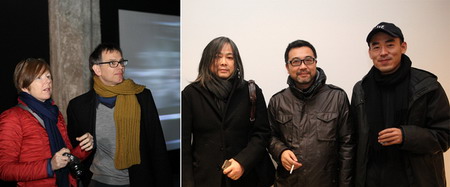 左:OCT当代艺术中心西安馆馆长凯伦·史密斯与策展人Marko Daniel;右:艺术家杨福东,杨振中以及张鼎