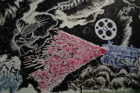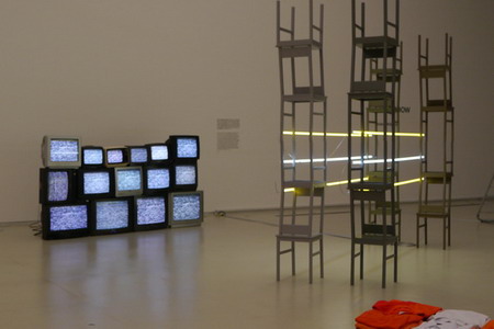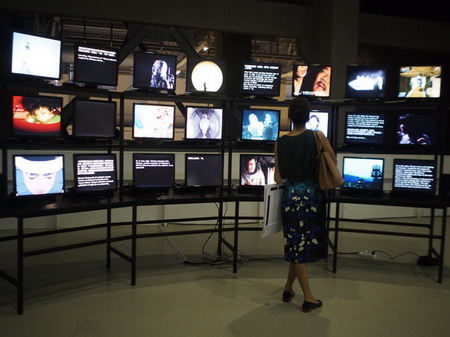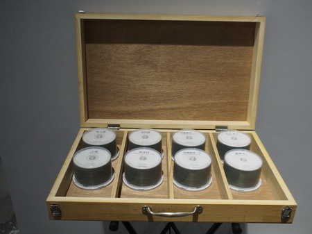 陈界仁《自我盗版——自由乐捐计划》2007年至今 这是陈界仁的一个行为艺术作品,他在台湾用摆地摊的形式在展览馆或者公共空间摆放这些“盗版DVD”,观众只要出钱、丰俭由人就能拿走一张;这些钱都捐给当地的社运团体。这里摆放的DVD和陈界仁捐出的DVD数量是一样的。