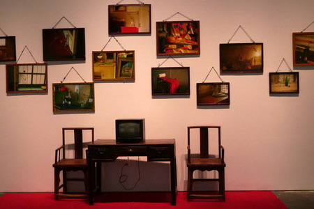 胡柳《信天游》混合媒材装置 2002-14。《信天游》是陕北民歌,因而承载有革命象征的含义,而徒步+骑行也是另一层革命长征的隐喻。胡柳的这个项目始于2002年,他从西安徒步出发,买了头毛驴就骑去了陕北南泥湾。沿途他用康乃馨交换村民不用的旧碗、家具或花瓶等。