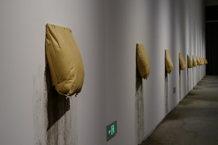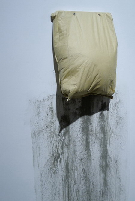 莫纳-沃特马努&弗罗林-图德 《尘》 装置 2007-2014 用不断撒着惰性粉尘的沙袋比喻“历史沙漏”。