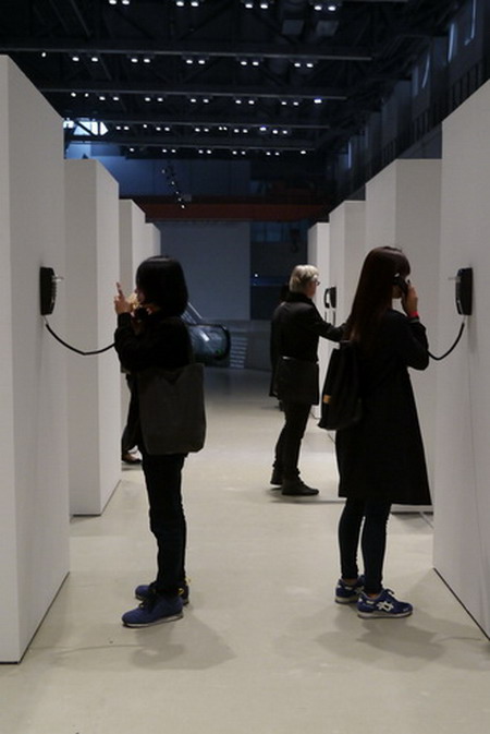 刘鼎的电话装置作品 每一只电话里声音内容都不一样,在你拿起话筒前永远不知道自己听到的会是什么内容,比如有批判主义言论,有老狼《同桌的你》。