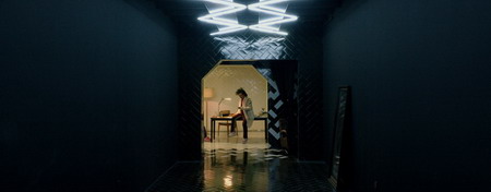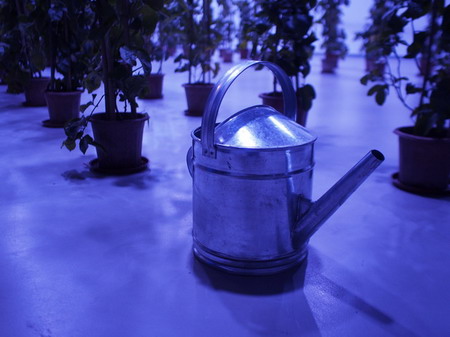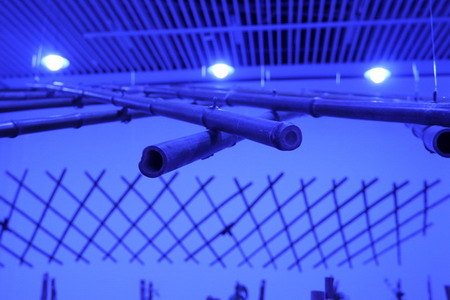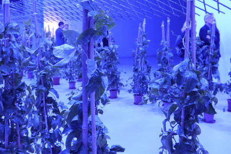 杨沛铿《百香果路》装置的细节. 作者用竹子和不锈钢搭建了一个建筑空间,里面种着似乎永远长不大的盆栽,蓝紫色的特殊LED光照似乎有一种虚拟乌托邦的讽刺意味。