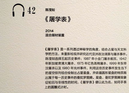 陈滢如《屠学表》 通过神秘学的角度,结合占星与天文科学的方法,重新审视了近代亚洲种族清算与屠杀的事件。陈滢如选择了五个屠杀案例,并有资料文献呈现。