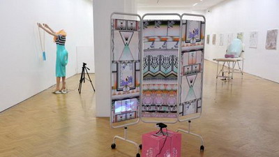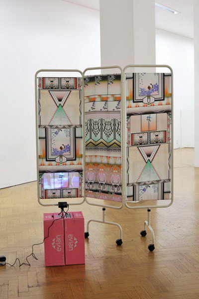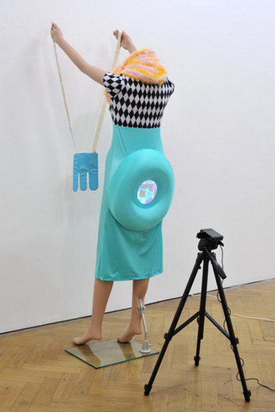 “不安宁的腿模(Restless Leg Mannequin)”(2014)是一件非常滑稽的雕塑作品:一个穿着蓝绿色紧身裙子的模特面向展厅墙壁站着,一个同色系的圆枕滑稽地从臀部突出来。枕头里安装着一个微型录像机,播放的视频中,“娜娜”似的人物欢快地摇摆着,保水性药物的广告词来回移动。夏娜·莫尔顿(Shana Moulton)用这件作品及“Activia按摩(Activia Massage)”(2014)暗示了主流广告中盛行的关于女性药物治疗的谎言(后者是一件装置影像作品,拍摄了艺术家虔诚地喝一罐Activia“瘦身”酸奶的画面);这样的营销方式利用了女性的不安全感及她们对臃肿腹部的病态恐惧。