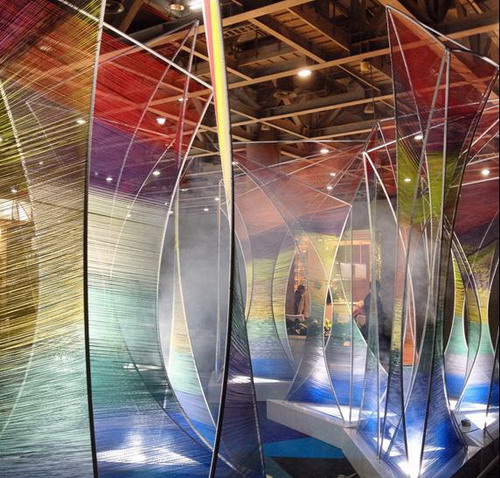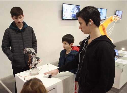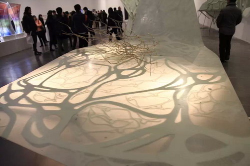 “人机未来”,通过展现当今世界最先进的基于机器人平台的数字建造作品,与参与者一起探索人类与机器协同创新的智慧未来。其中,Achim Menges的《2013-14 ICD/ITKE 研究展馆》、Roland Snooks的《复合翼 & 黄铜群》、袁烽的《拓扑表皮》、徐卫国的《拓扑准晶体系列》、高岩与郭馨的《智浪》、胡骉的《鹰》、宋刚与蔡嘉彬的《彩线森林》、张周捷的《OBJECT #SQN3-A》等作品,利用了新材料和新的建造方式来构建未来世界的空间形态。正如同建筑总是为未来之人而造,总是以探索崭新的空间形态为己任;人工智能技术也大致相当,它的出现旨在改变未来之人,以技术拓展出人的崭新面貌。左颂玟的《我们的第三只手》、戴森的《机器人手势转译》、南加州建筑学院机器人实验室的《幻影几何》、《机器眼》、《热网》,Bot&Dolly的《3D投影魔盒》,Rob|Arch协会的《Rob|Arch 2014 大会全球机器人技术应用》等作品,为当代人窥探未来人提供了一条可观的视觉途径。