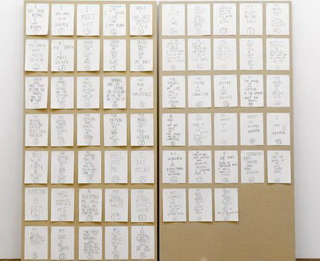 在包含了各式各样的媒介(比如灯箱、绘画、旗帜、雕塑和影像)的空间装置作品中,马特·穆里肯(Matt Mullican)展现了他个人的宇宙哲学,并以此尝试去研究真相与认知之间的关系。在深刻地认识到任何试图像百科全书那样聚集人类知识的行为都注定会失败这一事实后,他收集和分类了现有的物品、图像与符号,建立起它们之间的联系,因此创造出了崭新的交互作用与观点。