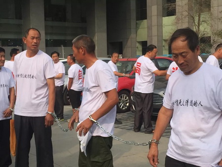 ▲ 老工人自带锁链前往陕西电信总部表达诉求,照片由艺术家提供