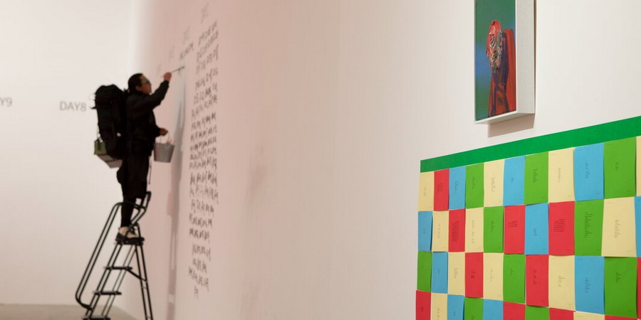 “剩徒”行为现场,加上诗歌和绘画是一个三位一体的结构。绘画和写作更具有职业性,是可以作为日常工作的,但行为不是一种融入日常创作的语言。我的作品有点像做某个事情,比如这次的走,跑,撞,写。很好描述,就像一个故事。但细节中会有一些表演性或仪式感,比如说撞完墙怎么看时间,怎么放置墨水桶,怎么在墙上记录时间。这次做完之后,我整理了一下行走的数据,写在墙上。7是每七圈撞击一次墙面,21是一共走了21天,1649是1647次撞击,11529是走的圈数,总共走了325809.54米,换算成公里是328.81公里。七圈里的第七圈是跑步,46.54是跑步的总公里数。20是《西宁》与这件作品一天不差相隔20年,3916是我从这20年间写作的诗歌中选了3916首。数字能将行动具体化,也是智能时代的现实,比如我们跑步,行走的步数以及心率等,都被数据化。