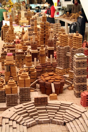 中国艺术家宋东擅长利用饼干、意大利熏火腿、巧克力以及其它食物为材料,制作复杂精致的城市或景观模型。这件名为“Eat the City”的作品创作于2006年,一共耗时7天才最终完成,曾在英国伦敦市中心的塞尔弗里奇百货公司展出。随后,宋东邀请在场的旁观者随便吃掉这座“城市”。尽管有人害怕这些放置了七天的面包会给肠胃带来不适,但这座“摩天大楼”仍然在很短的时间就变成了一堆面包屑。