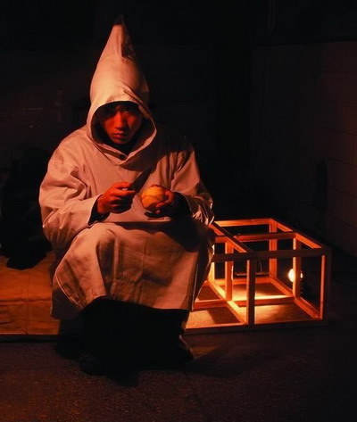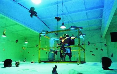 石青 《灭顶1》 表演 装置 钢丝/宣纸/ 面粉/厨具/ 玩偶 2001年