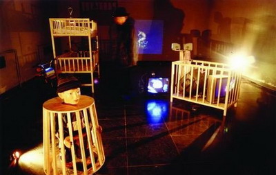 石青 《口语阶段》录像装置/雕塑/监视器/儿童车/儿童床/自行车零件/ 玩偶 2000年