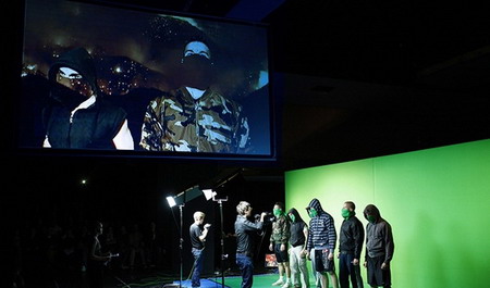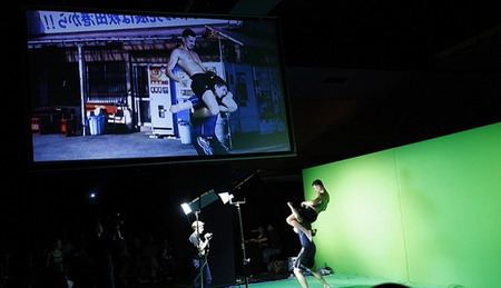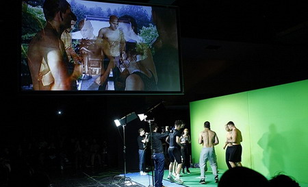 Dora Budor:还有旁边的两位摄影师,而整个场景则被布置得像是一间工作室出品,一个已完成了的产品。屏幕上播放的电影则是通过一种绿色键控技术实时完成的。观众可以同时看到投映出来的影像以及观众,但却是从不同的角度。