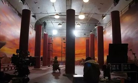 此次展览中,艺术家根据龙美术馆独特的结构特点,史无前例地在美术馆一层、阶梯式展厅创造性地打造出“宋代朝会”以及“生命之塔”两个颇为壮观的拍摄场景,它们同时构成了此次美术馆新电影计划的最核心组成部分。龙美术馆的一楼大厅变身成为主拍摄展厅,明日早朝的场景,营造的是重殿之城,皇宫的气氛。有如古希腊神庙般的宫殿柱子、火烧云背景既象征着热火朝天的议事气氛又仿若风云变幻的皇城。拍摄展厅的后方,无影墙的摄影棚设计,仿佛让人感觉皇宫内外就是一出戏,而尼采有意思的七句话,则串联起语言的黑色通道。展厅现场的还设有一个直播间。