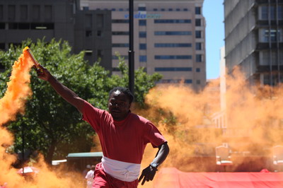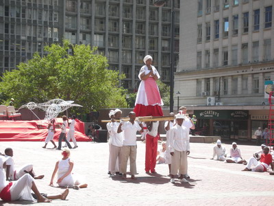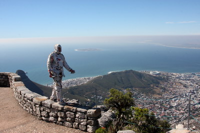 活动期间艺术家华继明共先后表演了两场,第一场表演“信息人在开普敦的行走”,第二场表演“信息人登桌山”。从北京出发前他购买了北京当天的各种报纸带到南非, 表演开始前就地报摊购买开普敦当日出版的各类主流报纸,将两个城市的报纸粘贴在自己的全身行走在城市广场和街道 。通过这个行为承载着北京和开普敦的信息,用行为艺术肢体语言来反思生活在这两个城市的人们对当今社会各个方面的思考,比如人们在开普敦遇到的生活问题,城市环境问题,工作问题,精神健康问题以及我们当今人所面临的各种信息压力和干扰问题等等。生活在南非开普敦这个城市的人们所面临的各种问题, 也可能是我们生活在北京所要面临的问题,他带着他的思考进入非洲。(文/华继明、摄影/达冰、玉梅)