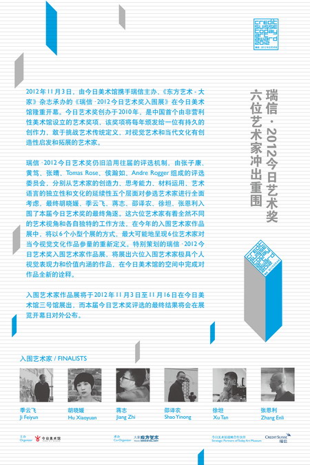 2012年11月3日,由今日美术馆携手瑞信主办、《东方艺术- 大家》杂志承办的《瑞信•2012 今日艺术奖入围展》在今日美术馆隆重开幕。今日艺术奖创办于2010 年,是中国首个由非营利性美术馆设立的艺术奖项,该奖项将每年颁发给一位有持久的创作力,敢于挑战艺术传统定义,对视觉艺术和当代文化有创造性启发和拓展的艺术家。