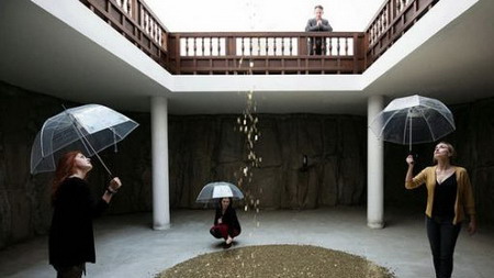 代表俄罗斯参展的是俄罗斯概念艺术家 Vadim Zakharov,他曾经参加过第 49 届威尼斯双年展,并且在 2006 年和 2009 年分别获得了俄罗斯当代艺术创新奖和 Kandinsky Prize。他本次的参展作品十分有趣,一边是一位西装革履的男士坐在屋顶衡量上吃花生,而另一边,则是在不断撒播金币,只允许女士撑伞入场。
