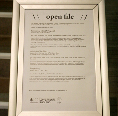 “Open File”是艺术家杰克·布林德利(Jack Brindley)与策展人蒂姆·狄克逊(Tim Dixon)进行的一场策展对话。这个项目在2011年2月首次出现时是以博客的形式进行的,现在则发展到了三个平台上:正在进行的现场活动系列,系列出版物以及以openfile.org.uk这个网站为基础的档案及资源。“Open File”尝试去探索通过这些平台开展工作的重要性与关联性。