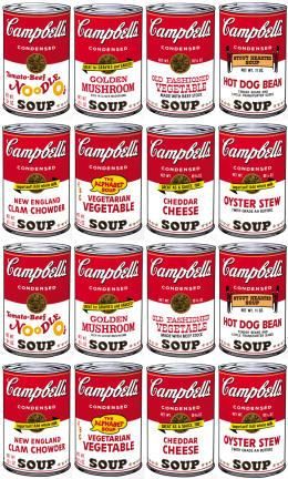 沃霍尔在他的职业生涯中,不时地返回相同的主题。这一点在“金宝汤”系列中表现得尤为突出。该主题第一次出现在他1961年至1963年的作品中。几年后,沃霍尔在1968年至1969年发表的作品中再度聚焦金宝汤罐。金宝汤罐就是沃霍尔的“招牌菜”。对沃霍尔来说,“金宝汤”是战后美国发展大规模生产之精神的永不停歇的赞美诗。因此,他选择“金宝汤”作为“美国精神”的真正象征和自己身份地位的载体。图为《金宝汤罐I:番茄》。