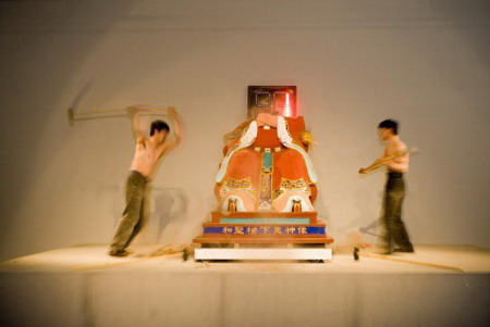 “第86尊圣像”的构想源自展望回家乡探亲时承担起的为祖先“和圣”柳下惠塑像的工作。通过族谱的追溯,艺术家建立起自身与“和圣”之间的血脉联系,并对自己作为“和圣”第86代子孙的境遇进行了思考。展望塑造了86尊相同的柳下惠泥塑彩像,在长征空间这个艺术实验的公共场所用二十多天时间砸碎85尊,最后竖起的第86尊完好保存并与其他85尊的碎片一起送给家乡的“和圣”庙保存,以此完成了一次自我的“忆古思今”之旅。