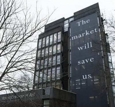 上周,我去了英国皇家艺术学院的研究双年展。展览叫作Disruption(瓦解),展期只有几天,但如果你错过了,也不用太伤心。很多作品缺少描述或说明,所以我没能真正对它们的质量作出判断。也就是说,还有有几件作品值得我们去一趟艺术学院的。首先,Bill Balaskas 的巨幅海报“市场将挽救我们”悬挂在英国皇家学院肯辛顿大厦的外立面上,该作品是对文化部分削减经费以及因此产生的企业赞助依赖所带来影响的一种评论。遏制艺术表达,考虑‘你做什么说什么’事实上只是审查制度的一种形式, Balaskas explained(解释道)。