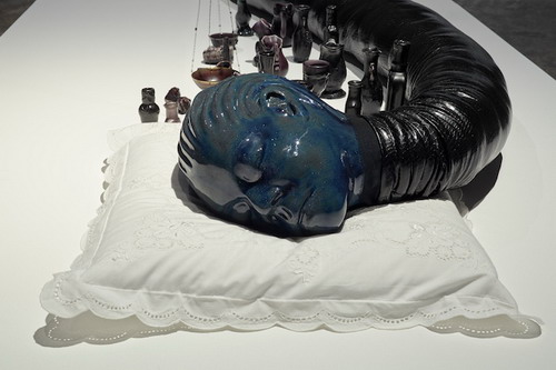 Wangechi Mutu “Sleeping Serpent” Mixed media fabric and ceramic, 91 x 91 x 945 cm (35 7/8 x 35 7/8 x 372 1/8 in), 2014