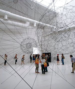 真正让人兴致盎然的作品,往往还是由于妙想,而与成本、材质、话题、政治没有多么直接的关联。阿根廷艺术家托马斯·萨拉切诺的《丝状星系》,用黑色橡胶绳编织出蛛网般的“星球”和“宇宙”,布满偌大的白色空间,观众穿行其中,躲避诸般牵绊。“如果剪断一根,这‘宇宙’是否就瞬间崩毁?”这是值得玩味、颇有所喻,也会让人好奇观察的疑问。