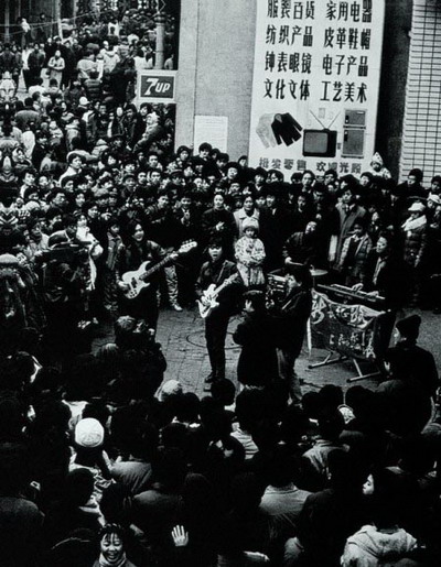 1991年,崔健和他的摇滚乐队在上海马路音乐会上表演。摇滚乐的兴起标志着时下年轻人对自由、精神解放、自我认知及新式生活方式的向往和憧憬