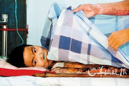全身严重烧伤的王碧雯目前正在英德市人民医院治疗 羊城晚报记者/林桂炎/摄
