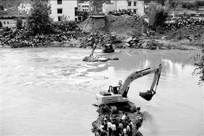 5月15日,搜救人员驾驶挖掘机在事故现场搜寻失踪人员遗体。新华社发