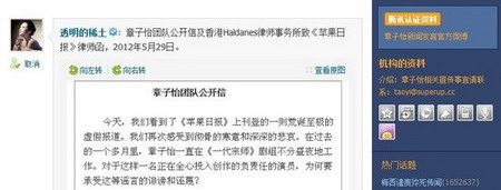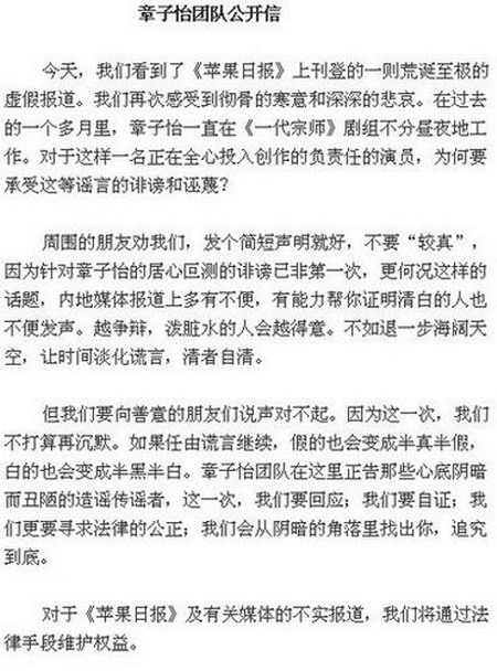 今天,我们看到了《苹果日报》上刊登的一则荒诞至极的虚假报道。我们再次感受到彻骨的寒意和深深的悲哀。在过去的一个多月里,章子怡一直在《一代宗师》剧组不分昼夜地工作。对于这样一名正在全心投入创作的负责任的演员,为何要承受这等谣言的诽谤和诬蔑?