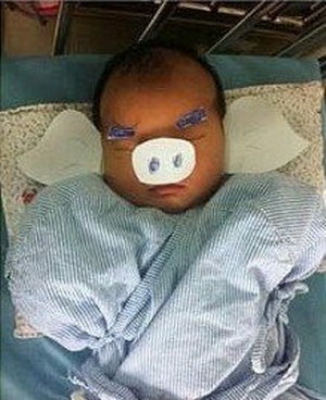 在被曝光的截图中可看到,一着蓝色无菌服的人用左手扯起两名襁褓婴儿,在婴儿脖子处于随意耷拉着的状态下拍摄照片。另一张图片则显示,一正酣睡的婴儿脸上被贴上了猪鼻子、猪耳朵、蓝眉毛的纸片。在该用户的图片说明及和其他用户的互动中,有“给他把屎把尿的给我玩下总可以吧”等话语。该用户还将这些照片转给了一些好友。