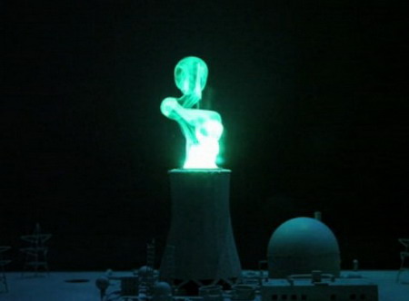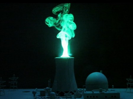 从冷却塔排放出来的气体发着绿光慢慢升腾,并且在发电站上方飘荡。有色的水被汽化,其排放受电脑控制,来自于水箱底部的阀门,一系列虹吸管控制着蘑菇云的形状和持续时间。