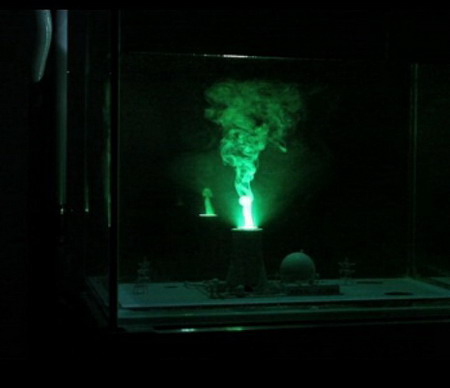 在一个规格为80x70x60cm的水罐上,艺术家制作了一个高度仿真的,带有附属建筑物的工业区。这个持续20分钟的作品在核冷却塔、气体景观和原子蘑菇云之间紧密地循环。
