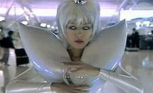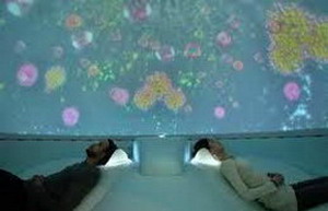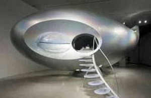 日本当代艺术家森万里子(Mariko Mori 1967-)自1990年代中期开始享誉欧美。森万里子生于东京,曾在时尚设计学院学习,同时兼职服装模特儿。后来到伦敦去学习艺术,然后到纽约去做艺术家。在早期的电脑合成影像作品里,她常把自己乔装成各种浮艳的造型,时尚的,古代的,天外的……等等,森万里子的作品超越了年代,结合了日本传统,东西方艺术的形式和主题,还有当代国际化的文化景观,例如时装、科幻电影、流行文化和电脑互联网。她那宽银幕式的、技术含量很高的当代作品和形象,使她被公认为本世纪「新人类」艺术的典范。她于IBM大楼中庭设置的《幽浮波》(UFO Wave),更予人无穷的惊喜。 这件外观充满科技感、像水滴状幽浮船的物体,长三十四英尺,高十七英尺,撑离地面约五英尺。观众可循着一座扶梯进入舱内,每次仅限三人,斜躺于符合人体工程学原理研制的座垫中(头部设有电极配备),然后头顶的圆顶将映现一段七分钟长的画面。《幽浮波》结合了实时电脑设计、脑波扫描技术与数位录像动画--脑波讯号器对人脑活动进行扫描,每人稍一动念,脑波信号就会影响和更改头顶上的形象,其视觉效果如天际奇景,幻化莫测。森万里子借助西方尖端科技来呈现、延伸传统的东方的思想和审美境界,唤起人类对于美好和无限的向往,并以此改变对当下现实世界的认知。