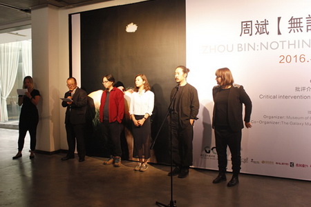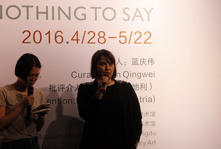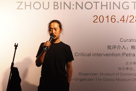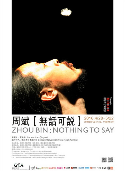 4月28日下午3:00,“无话可说”:周斌个展于成都当代美术馆开幕。本次展览由成都当代美术馆主办,重庆星汇当代美术馆协办。批评家、美术馆的执行馆长蓝庆伟担任策展人,并邀请长期关注中国行为艺术的奥地利学者鲍贝蒂(Petra Polzl)作为批评介入。
