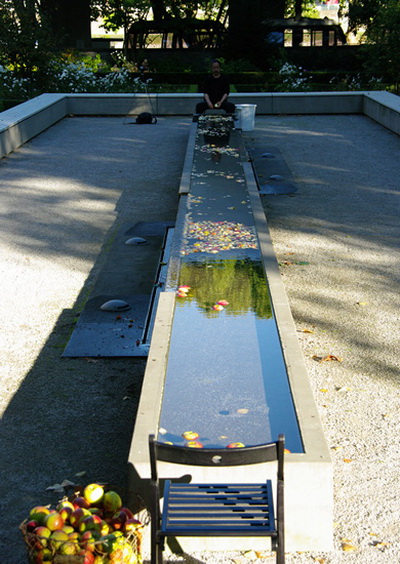 过程:两筐苹果,放在水池的两端。周斌坐在一端的椅子上,一个个的咬苹果,把咬下来的苹果丢到水池中,每丢一次念叨一句“Too Much”。直到两筐苹果全部咬完,公众可坐到对面的椅子上互动创作。作品历时四小时
