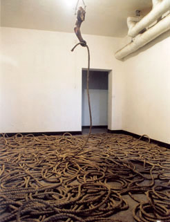 以上即是朱昱最主要的几个行为艺术作品,首先,我对他在《献祭》和《植皮》里所表现出的那种对艺术的献身精神表示敬意,一个具有伟大的献身精神的艺术家是值得世人尊敬的,而不是反之。就我的理解,朱昱的《全部知识学基础》和《袖珍神学》两件艺术作品是在探讨肉体和精神分离之后的境况。人是文化意义上的人,脱离了精神的尸体,已不是人。即便是精神和思维的载体——大脑,脱离了精神一样毫无价值、毫无意义。正如笛卡儿说:我思故我在!可是现在这个世界上有那么多人没有灵魂、没有精神也不去思考,他们一样活着,但他们和一具尸体有什么区别呢?所以我认为这两件作品是对欲望代替情感、金钱操纵灵魂的这种现实的批判,而且《袖珍神学》里的那条长长的绳子应该是一个长长的隐喻,我想它是在寻找丢失的精神。《植皮》里宣扬的应该是一种自我牺牲的精神,朱昱可以用自己身体的一部分去补救一块毫无用处的死肉,那么我在想他对一切活着的肉体和痛苦会是一种什么样的态度呢?《食人》这件作品会引起每个人的生理反应,我相信,只要你是人,你就不会对这种行为无动于衷。在人类历史上有很多次战争和饥荒,都发生过人吃人的现象,所有人都知道这是丑恶的,然而这种事情毕竟离我们很遥远,不痛不痒,而朱昱将它活生生的摆在了我们的面前,让你必须去面对和正视,感到恶心了是吗?那么多发生在世界上的真实的人吃人的事件(物质的)该怎么说?鲁迅先生在《狂人日记》里所表达的:翻阅两千年的中国文明史,只有两个大字:吃人!(精神的)又该怎么说呢?我为人类的虚伪和虚荣感到脸红。《献祭》里表达的或许是神不在场的年代,人的狂妄和无意义。从原始社会一路走来,献祭这种行为伴随着人类的成长。那时候神高高在上,人卑微而渺小,每个人都心存敬畏,很少有人会胡作非为,因为苍天在上,朗朗乾坤,人们可以通过献祭来表达自己的真诚和对罪孽的忏悔,以换取自我心灵的安慰和解脱。可是现在,上帝死了,上帝死了意味着什么都是允许的,所以我们可以胡作非为了,我们可以肆无忌惮了,我们再也不用献祭了,因为神不存在,人就是神,所以我完全可以把自己的后代献祭给一条狗,因为我愿意,因为你管不着。朱昱的《献祭》正是通过这样的自我牺牲,对人类的狂妄和胡作非为进行了强而有力的鞭挞和控诉。