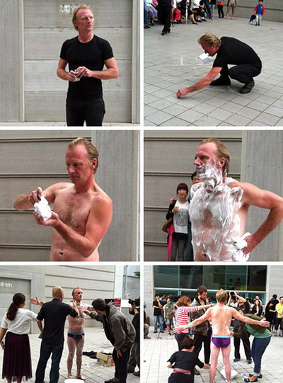 9.9光州双年展展场行为艺术专场,来自纽约的Erik Hokanson的作品,让人们加入刮他身上的体毛.....