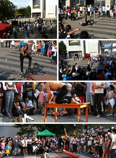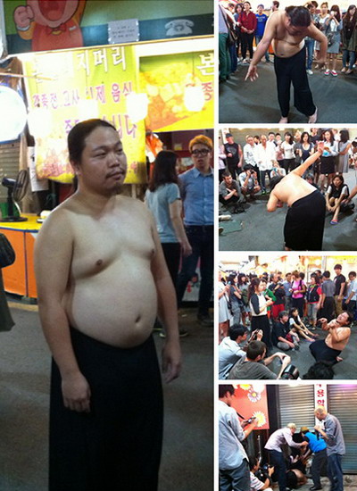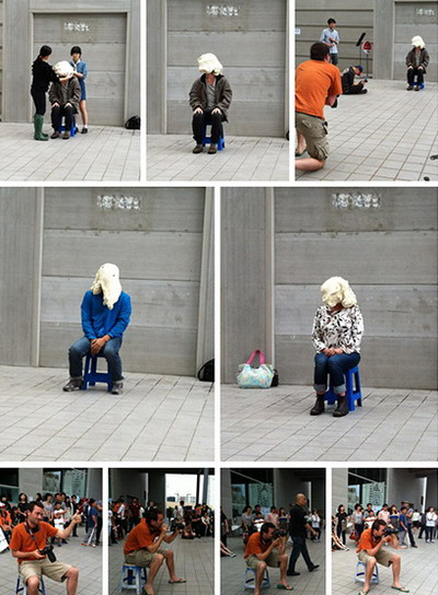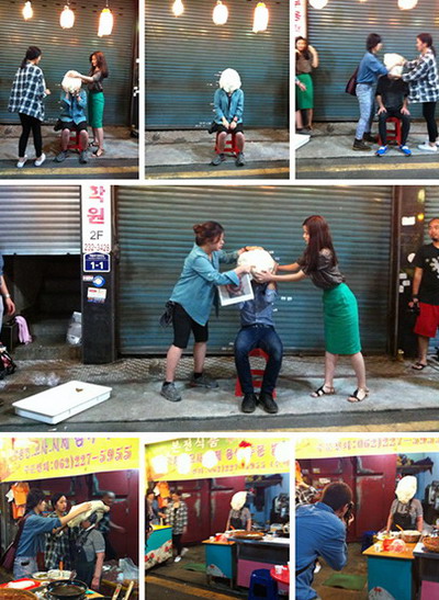 夜市场行为表演:9.8晩光州夜巿场,丹麦艺术家Soren用发面放在观众的头上充当"一种正在变形的面孔",他每做一个都拍下来,这是一个系列作品计划。他先摆拍,再移到正在做活的人拍,始终有几个女助手帮忙。这个没有道理的作品,似乎又很有趣。