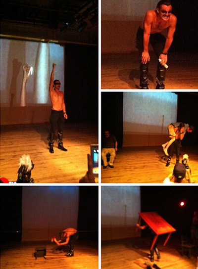 9.8光州双年展展场,波兰艺术家Arti一身黑衣,先在头上喷上白色,将一石梱于一脚下,另一边用钉子穿过鞋钉在凳子上向远处的桌子移动,踏破几个玻璃杯,有时用黑手指将杯中水弄黑,有时放进从身上刮下的布往口中咽,伴着自己录下的梦呓之声,又将脸喷出黑手印,原是切割桌子拉不出电,只好摇散了桌子。