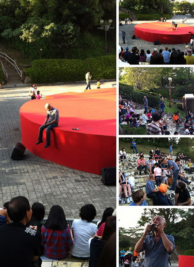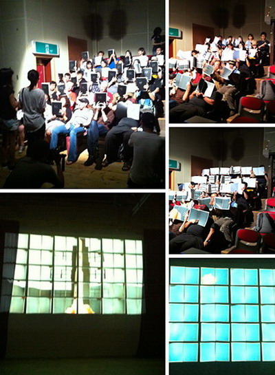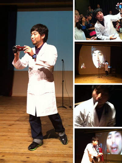 日本艺术家Camera以非常轻松自信的方式完成了一件作品,他用摄影机拍他唱歌和现场观众,当即又用投影机重播同歩唱一遍,现实与影像重叠,作品流畅,搞笑。