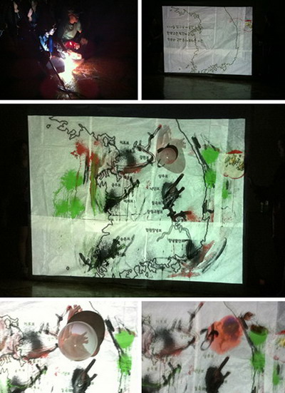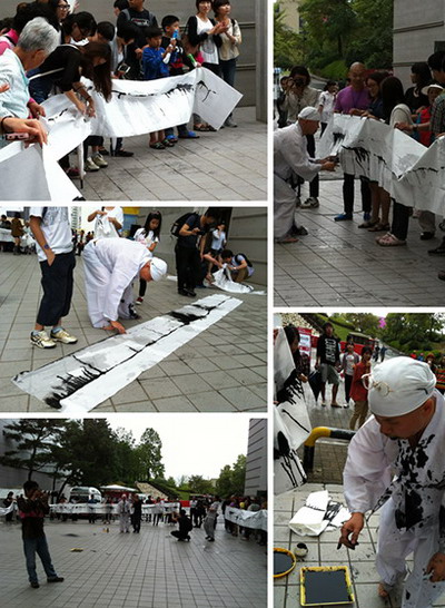 9.9光州国际媒介行为节双年展展场第二回行为艺术专场作品:韩国行为艺术家用水墨。