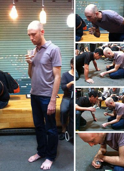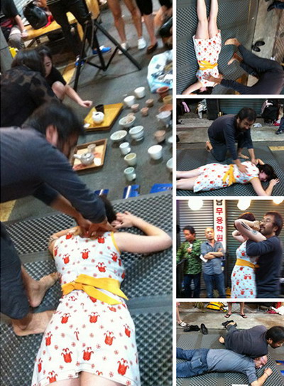 9.8光州夜巿场,美国艺术家Eric Nelson手持一玻璃杯静态从站立到跪在地上的行为长达二小时,张着大口,杯子接流出的吐液,最后用吐液在地上写出他的密码。中间一喝多的本地男人与他对视许久后来打了他一耳光,在众人的推劝下那人才离开,过了一会那人回来丢给他一万韩币-奇怪的交流,Eric自始至终沉静。