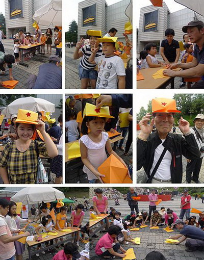 9.8 蔡青的“红星照亮光州”行为作品很吸引人,许多人加入互动行列。艺术家教观众叠纸帽,再赠给每人一个红星。人们涌跃参加,亲自动手做自己的帽子,在很短的时间里就用尽了100张纸。最后只好用报纸叠了儿个帽子。作品强调“人人都是艺术家”,让生命闪光,我们都是闪亮的红星。